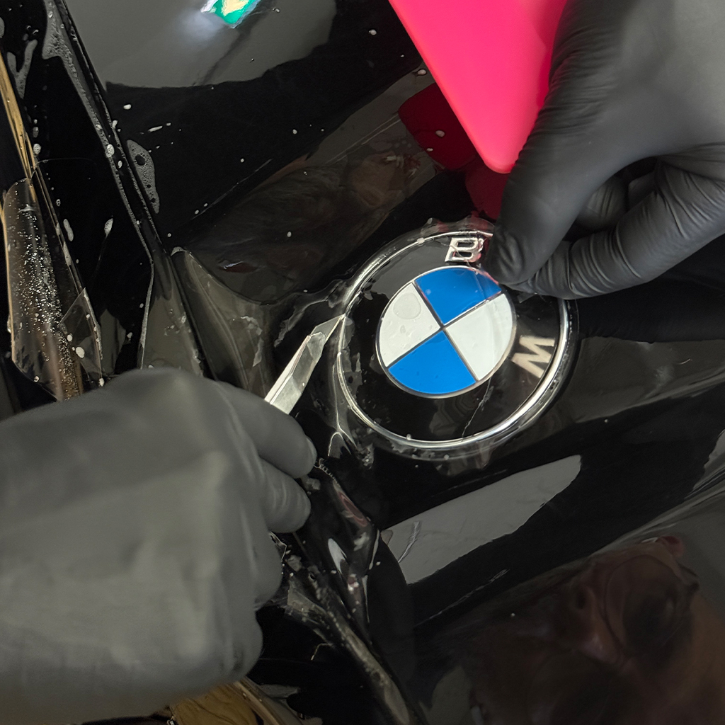 Lackfläche und Folie werden mit Montageflüssigkeit besprüht, die Folie wird aufgelegt und exakt ausgerichtet.