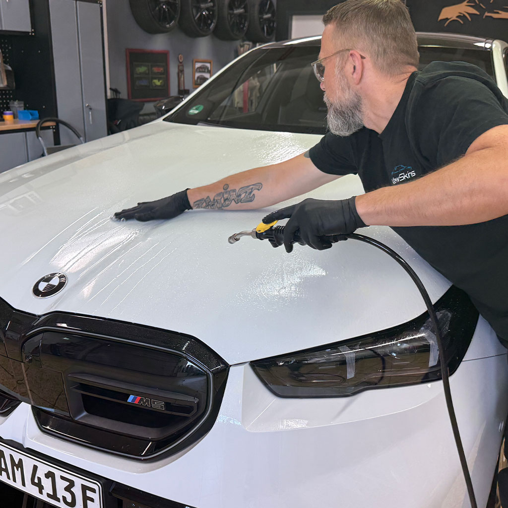 Nach vollständiger Haftung erfolgt eine Endkontrolle, Reinigung der Folie und Übergabe des Fahrzeugs an den Kunden.