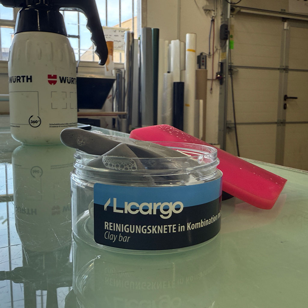 Behandlung der Lackoberfläche mit Reinigungsknete zur Entfernung von Feinstpartikeln und für eine glatte Oberfläche.